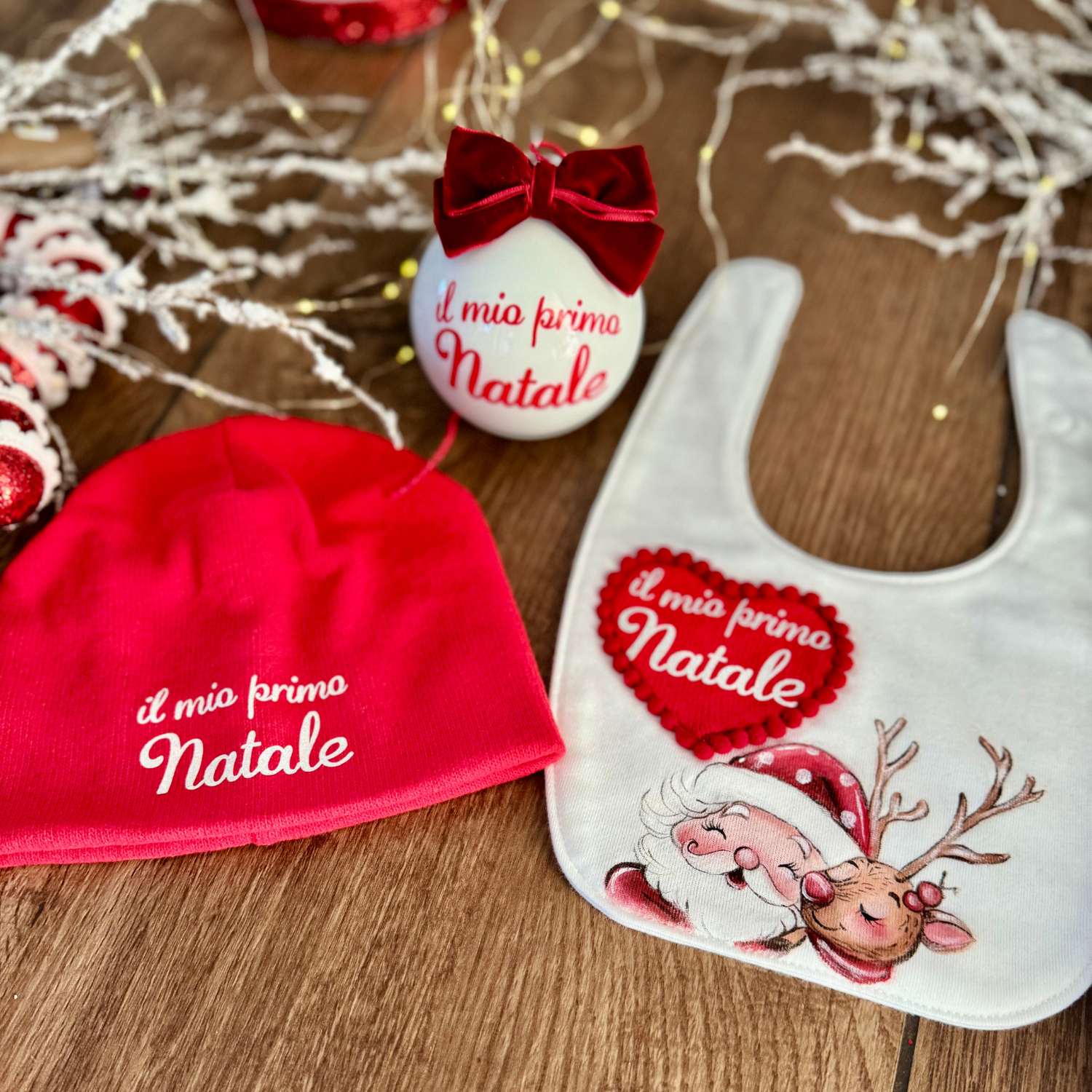 Cappellino in caldo cotone rosso, con scritta "Il mio primo natale" in glitter bianco. Personalizzabile con nome.