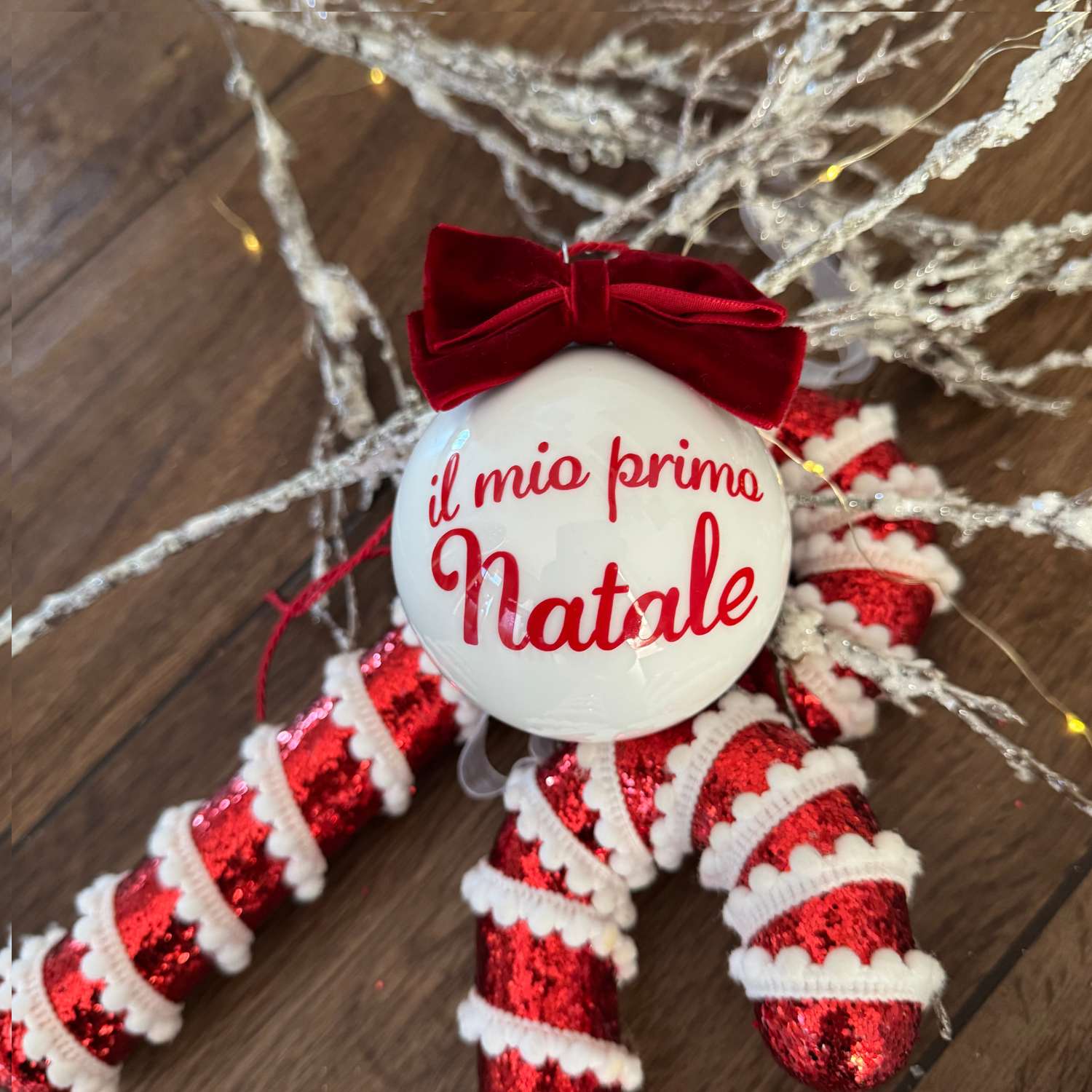 Sfera natalizia in vetro bianco, con fiocco in velluto rosso e cordoncino, scritta applicata a mano. Circonferenza 8 cm.