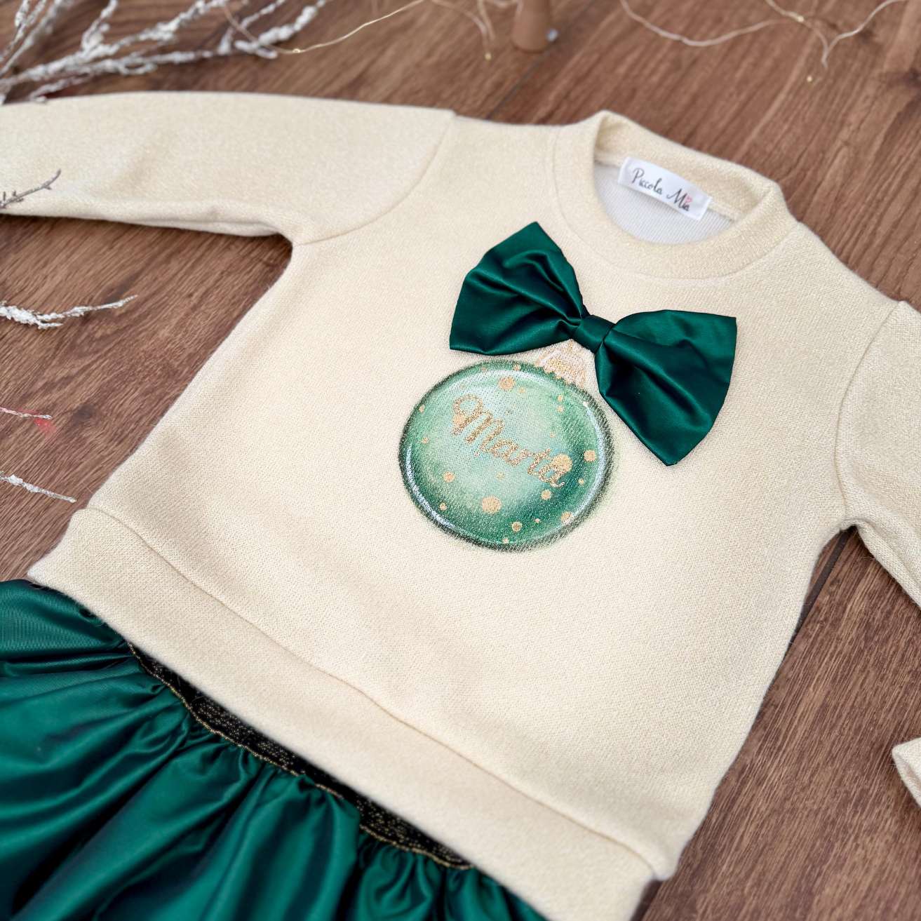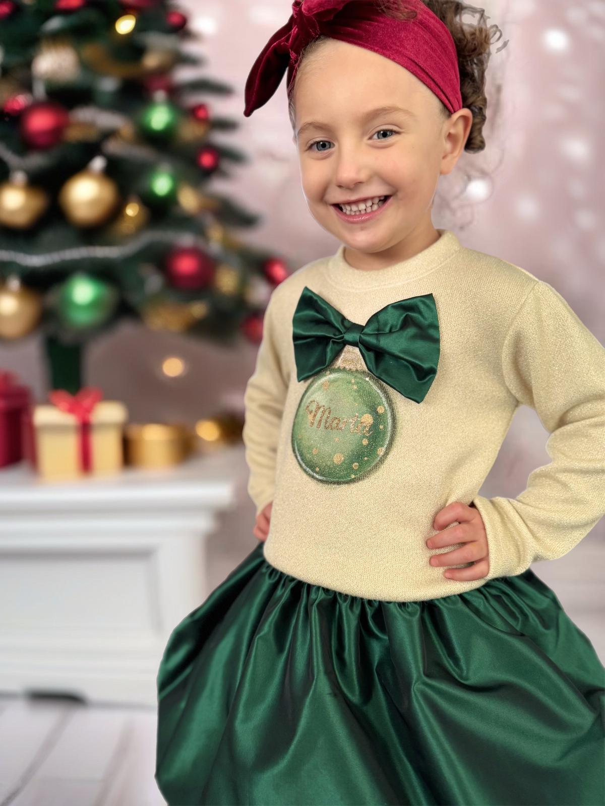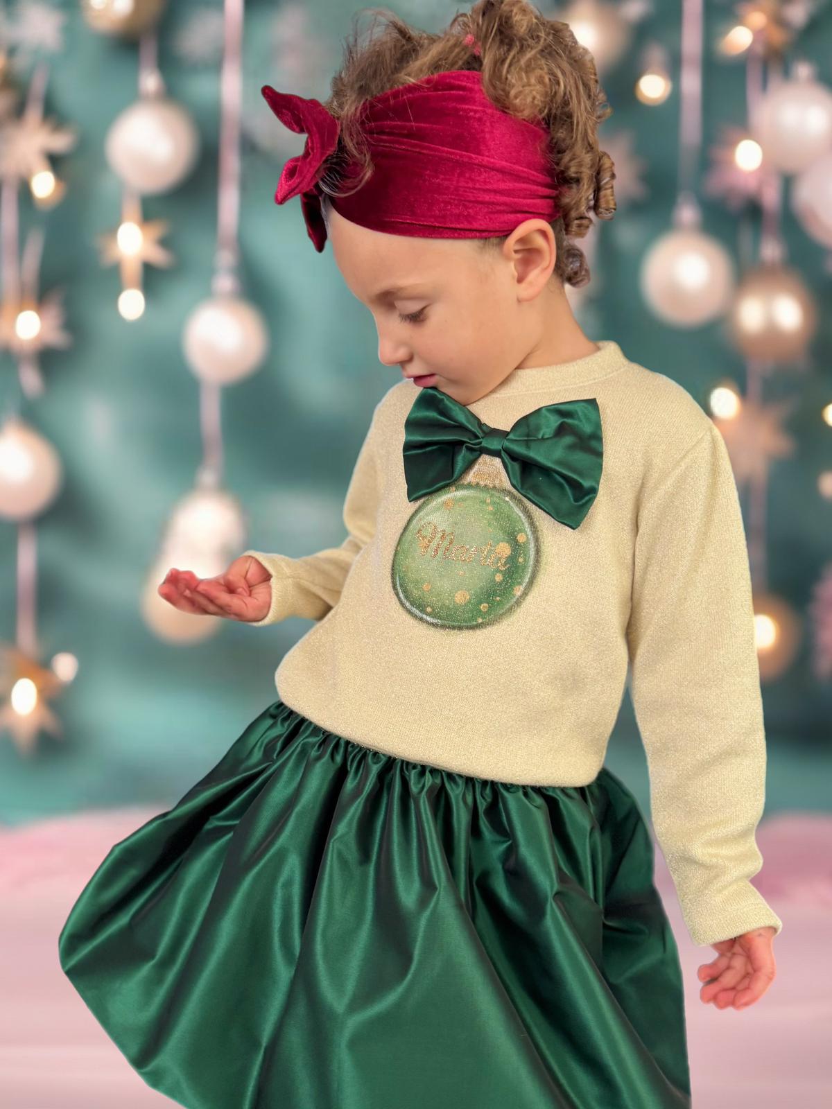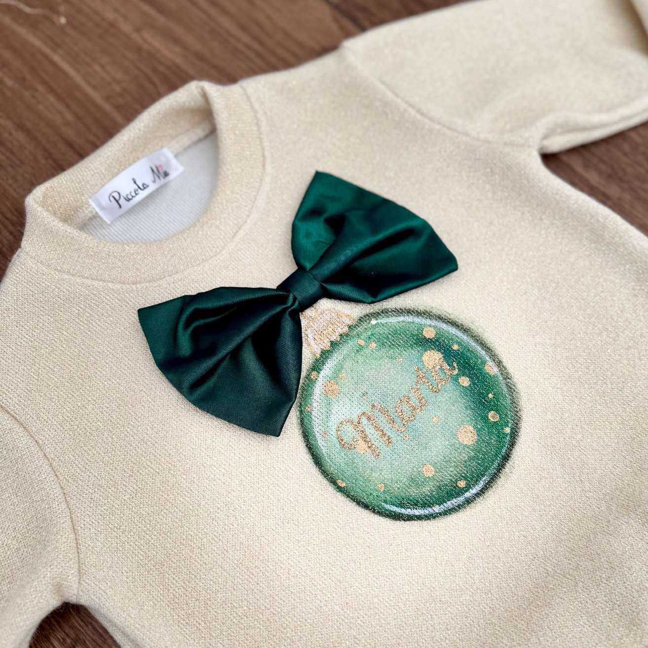 - Maglia morbida in lurex oro, con palla natalizia dipinta a mano, personalizzabile con il nome in glitter oro. Arricchita da maxi fiocco taffetà riapplicato