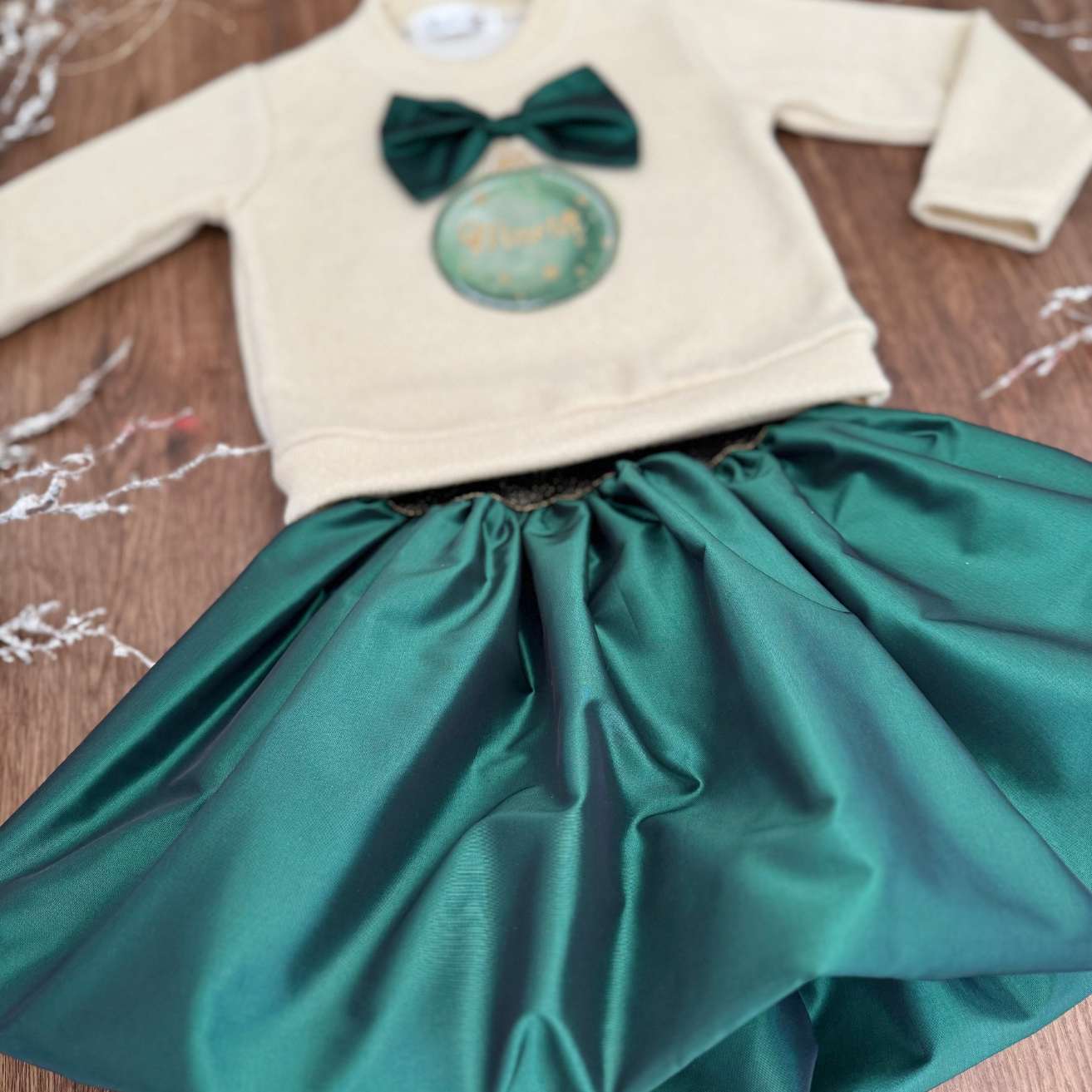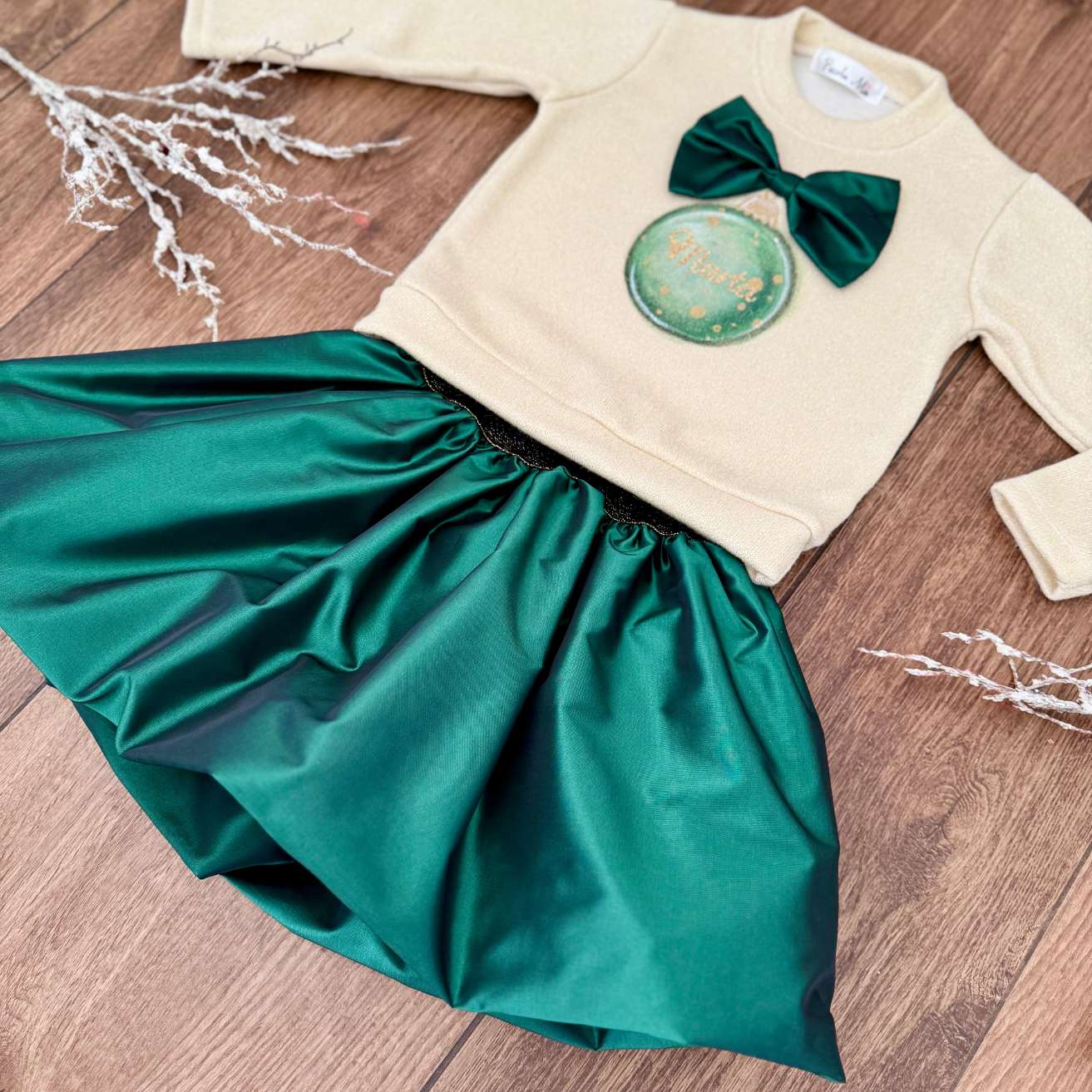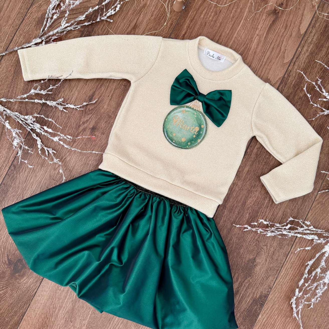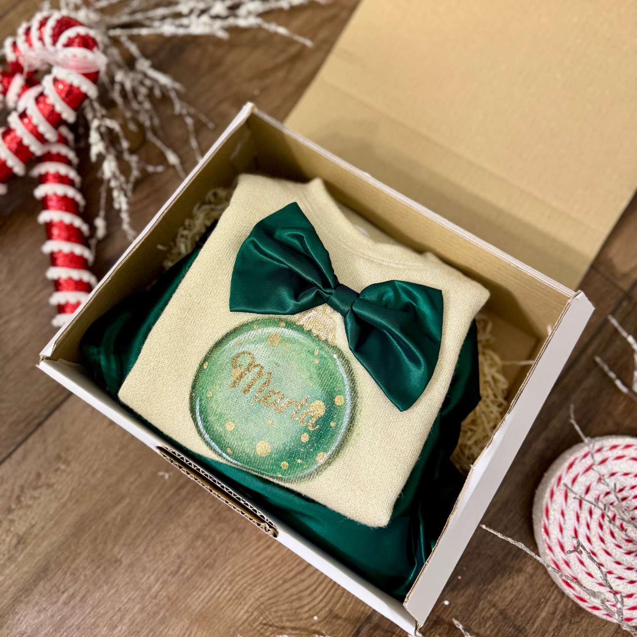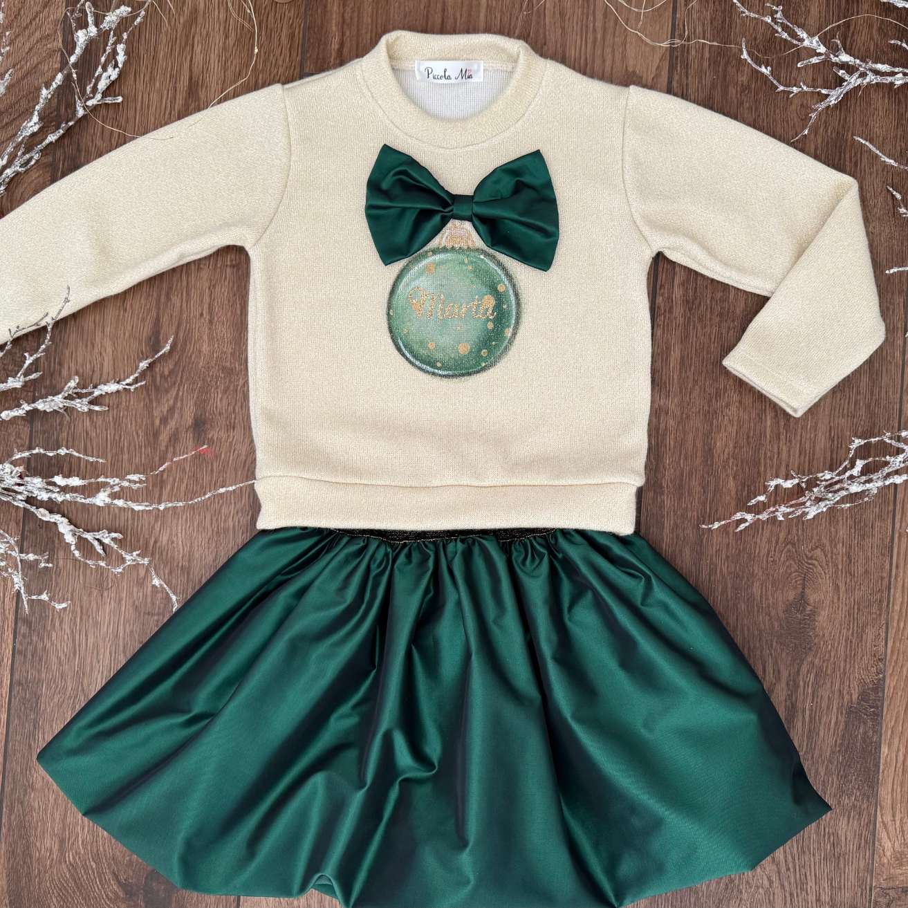 - Maglia morbida in lurex oro, con palla natalizia dipinta a mano, personalizzabile con il nome in glitter oro. Arricchita da maxi fiocco taffetà riapplicato