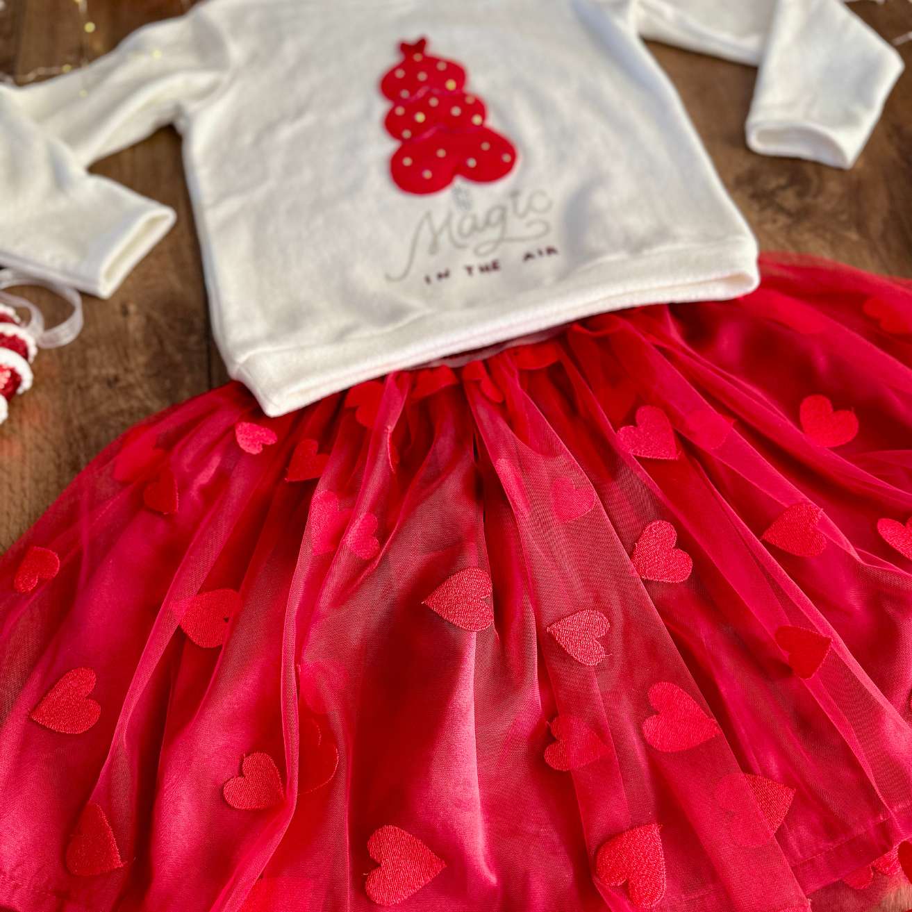 - Gonna in tulle rosso con cuori ricamati all over, nastro in velluto sul fondo, fodera in raso ed elastico in vita