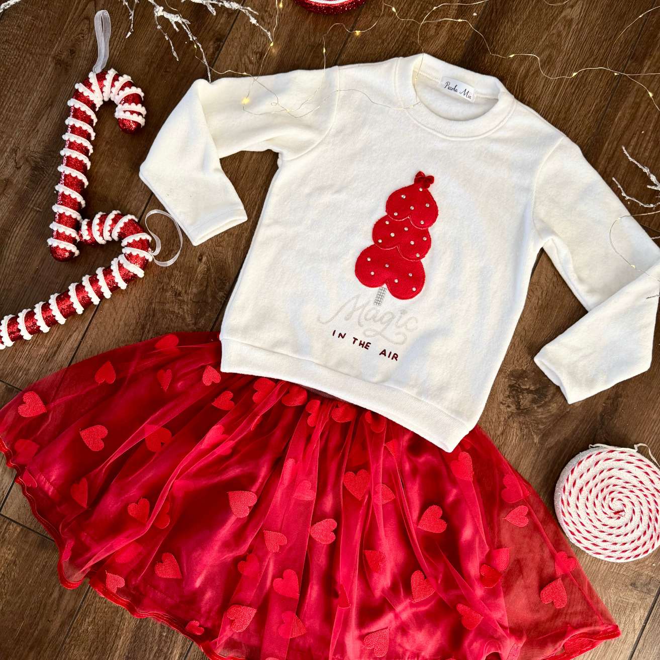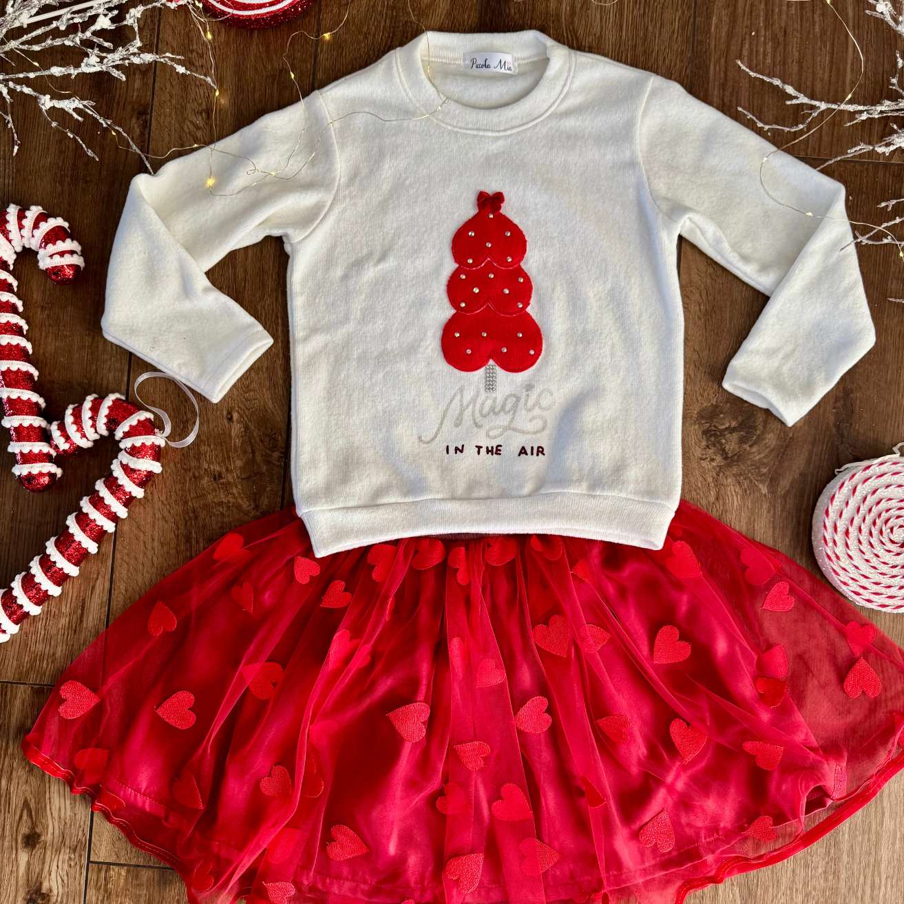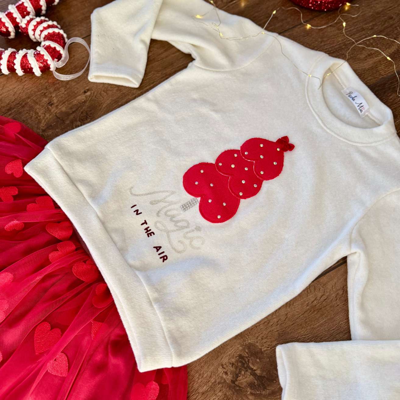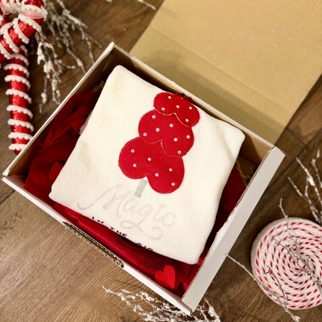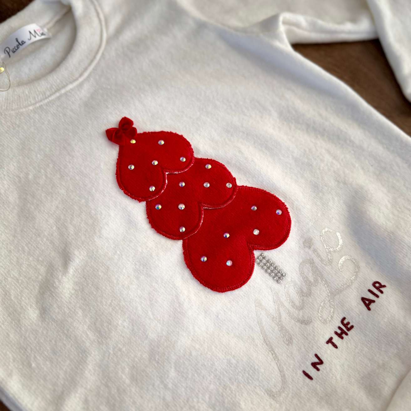 - Maglia in cotone bianco, cuori ricamati e riapplicati che danno forma ad un albero di natale. Strass e pietre applicate a mano, scritta in glitter bianco e rosso. Personalizzabile con nome.