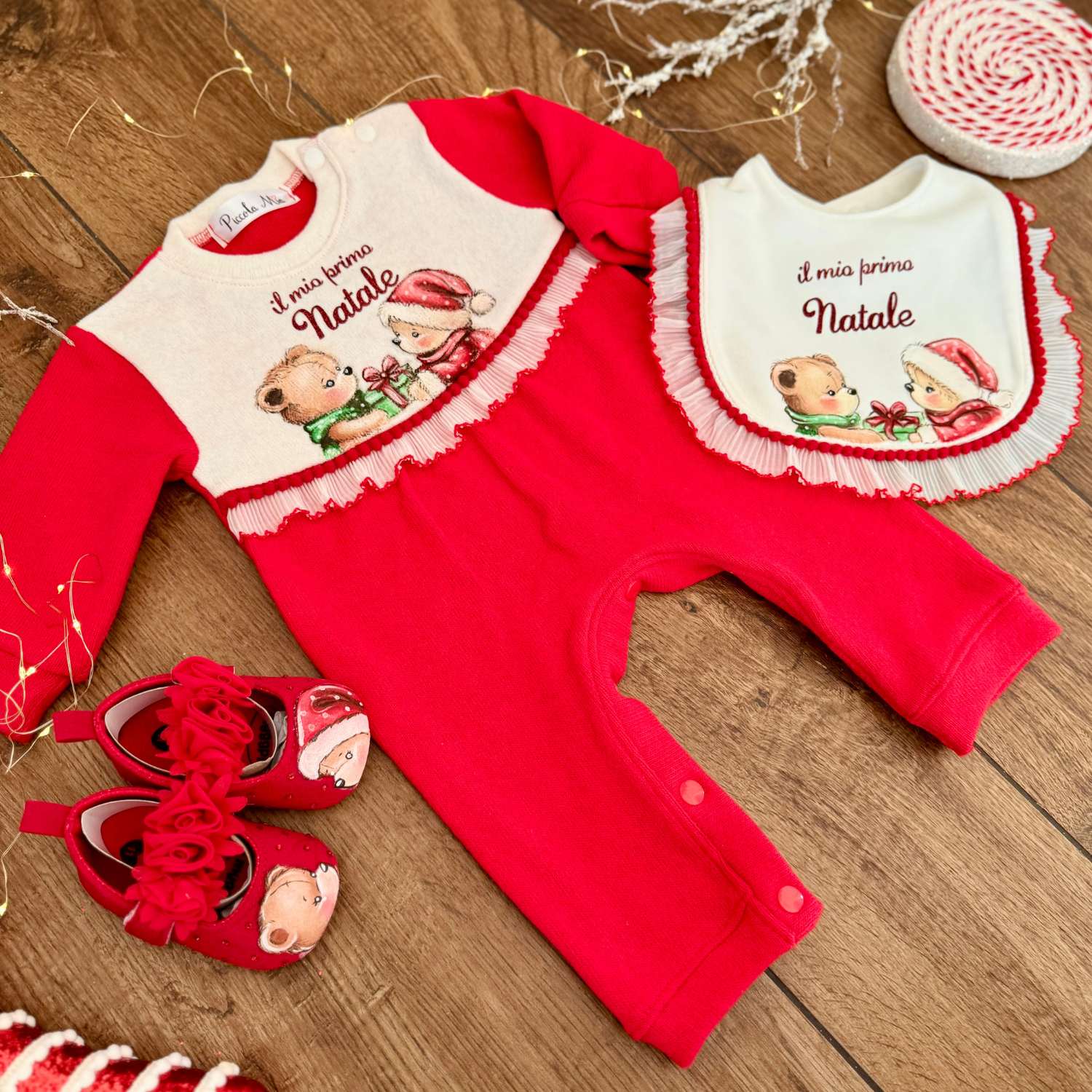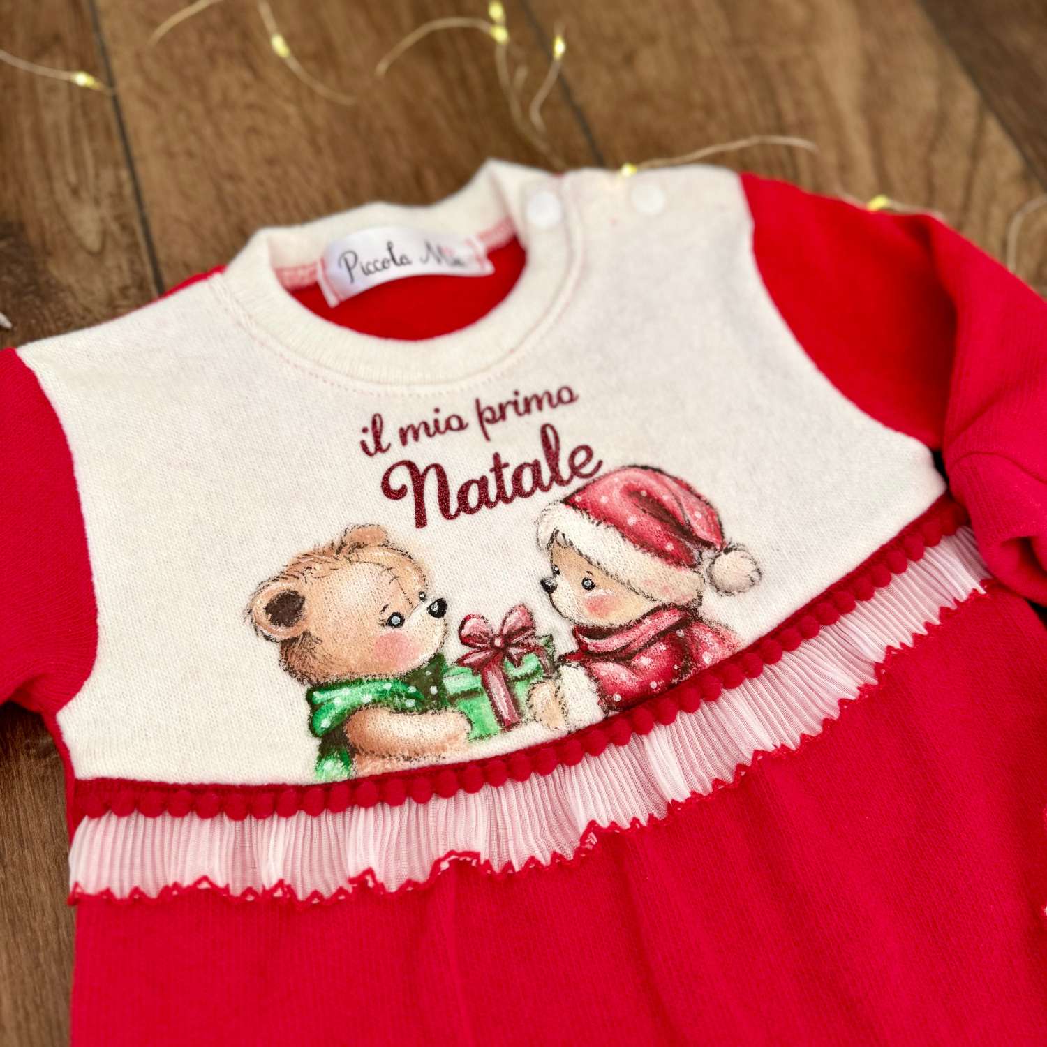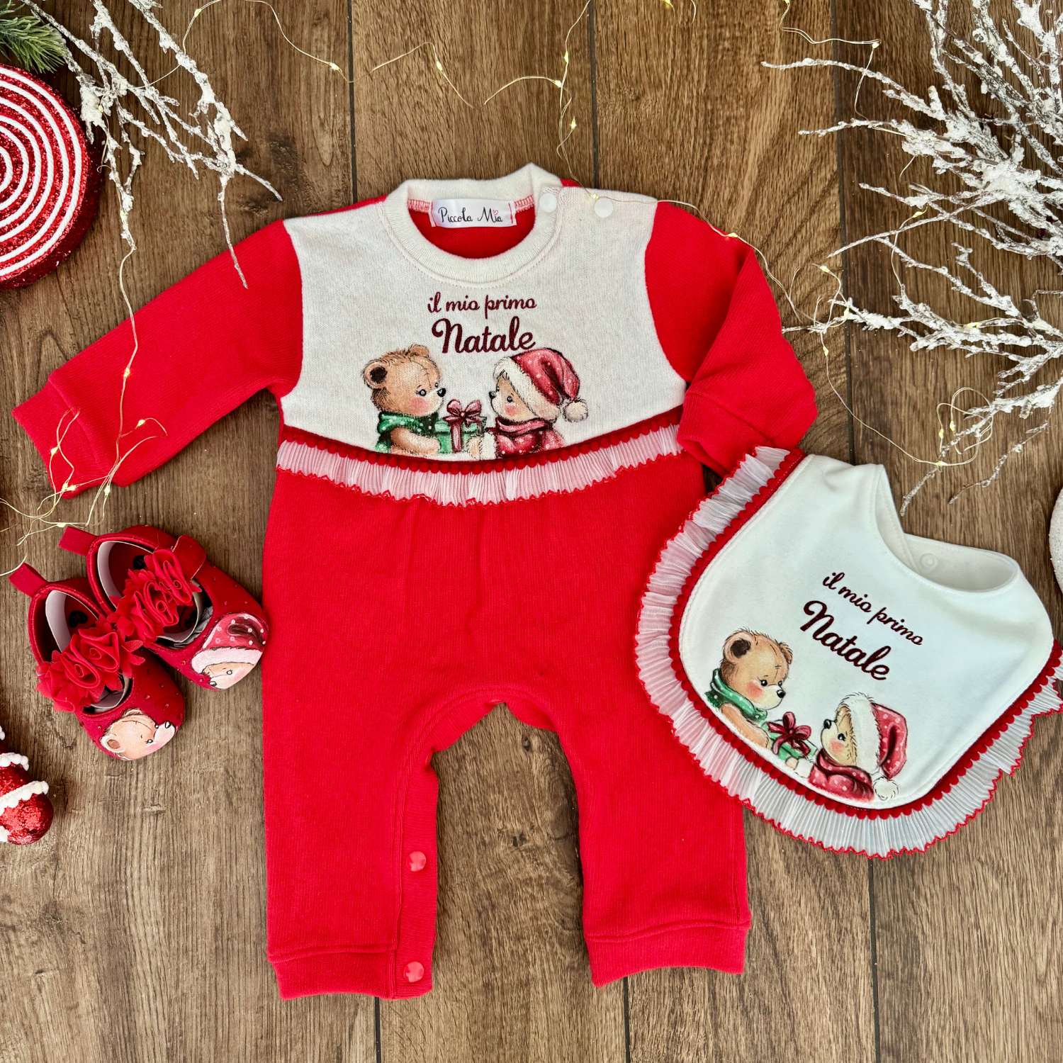 ♥️ Tutina realizzata a mano, in caldo cotone bicolore, con orsetti dipinti dipinti a mano. Scritta in glitter rosso, applicazione pon pon rossi e passamaneria plissettata bianca e rossa.