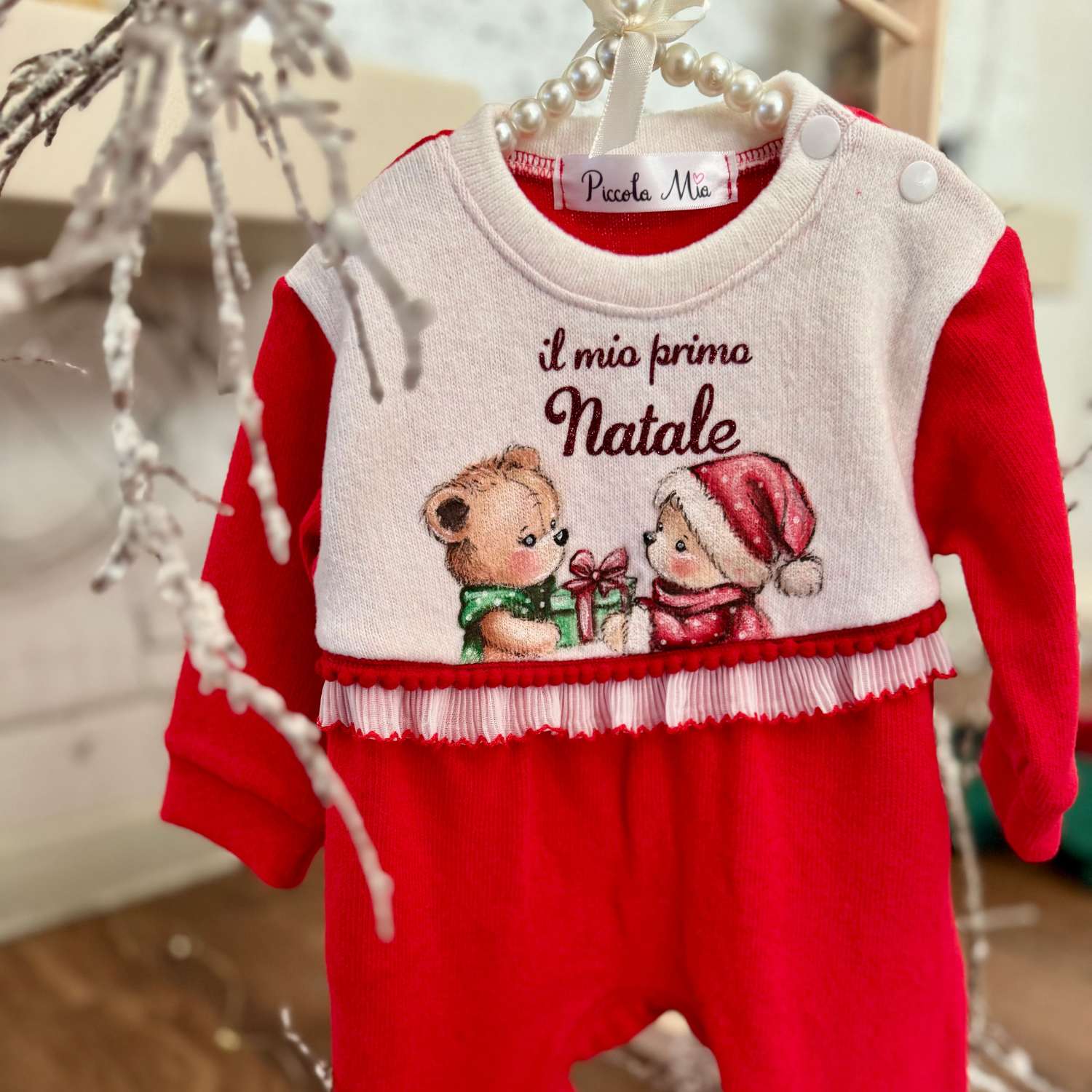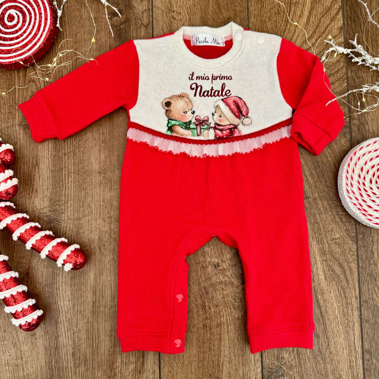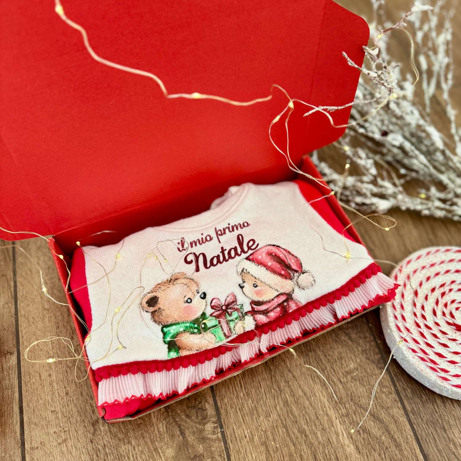 ♥️ Tutina realizzata a mano, in caldo cotone bicolore, con orsetti dipinti dipinti a mano. Scritta in glitter rosso, applicazione pon pon rossi e passamaneria plissettata bianca e rossa.