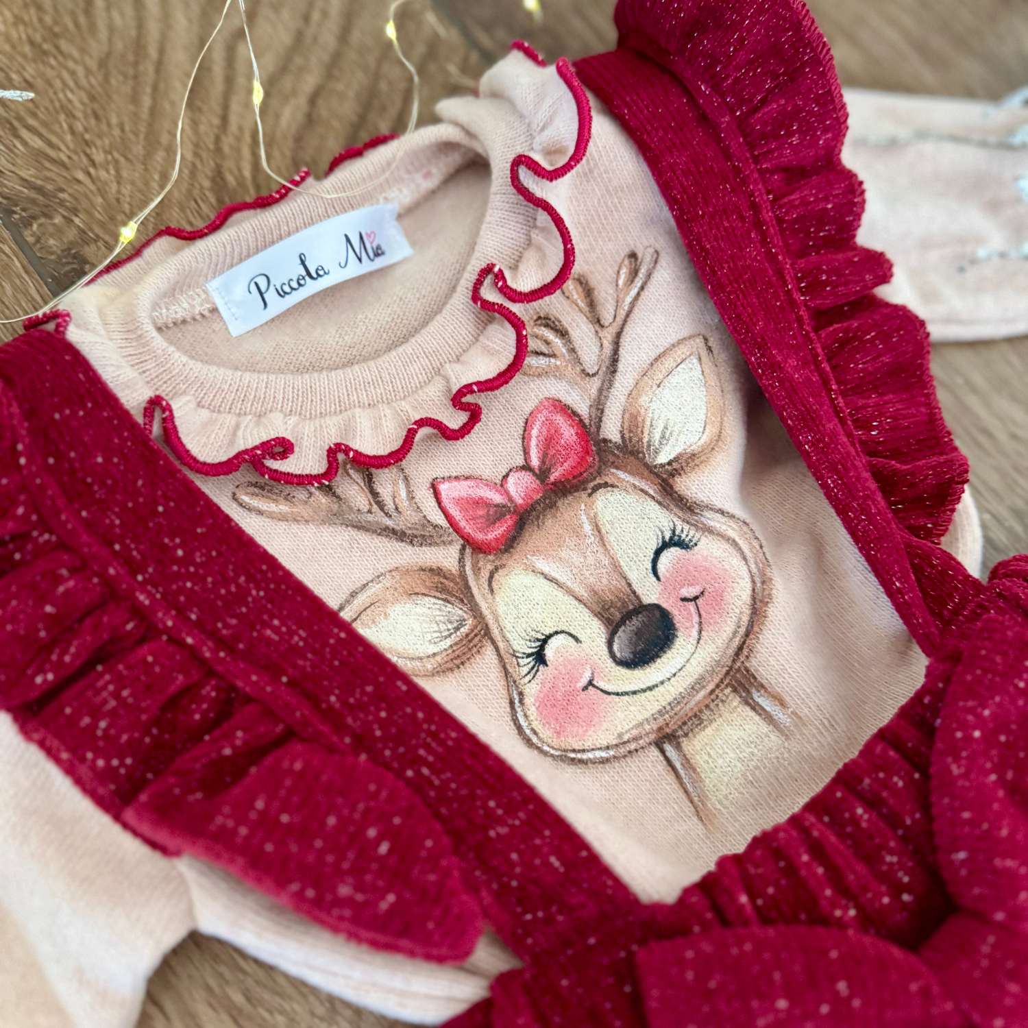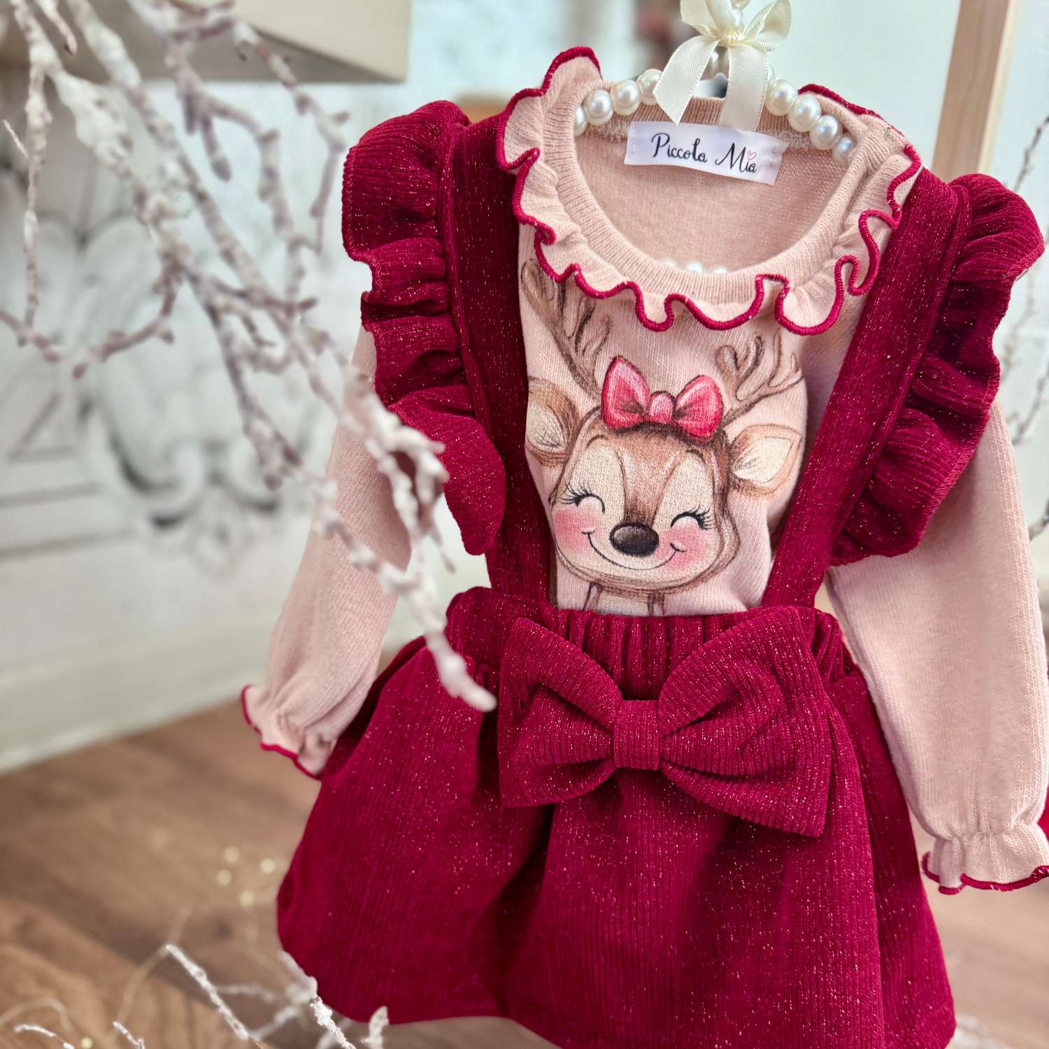 - Pagliaccetto in velluto bordeaux a coste con lurex con maxi fioccocon dolce cerbiatto dipinto a mano e fiocco applicato