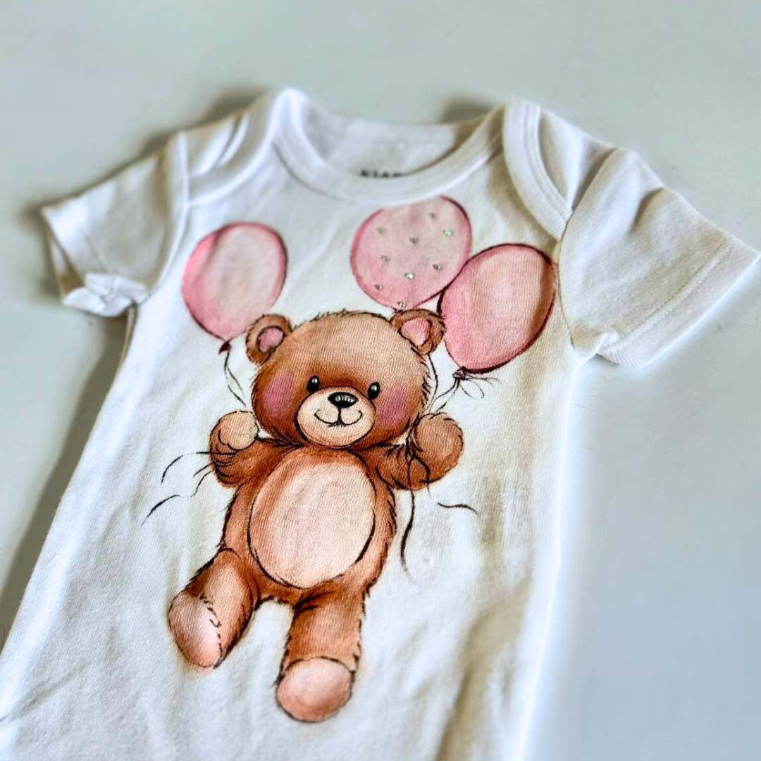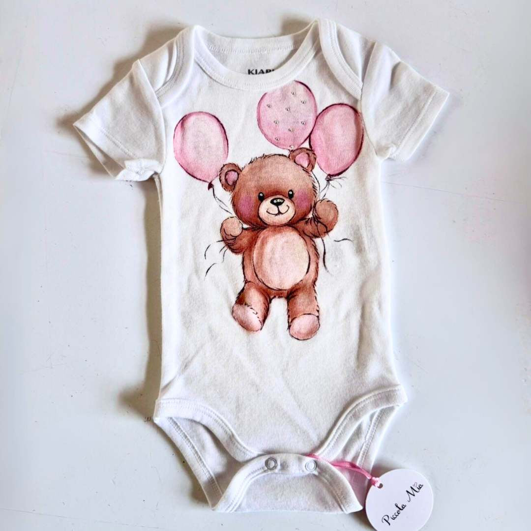 - Body in 100% cotone con scollo americano, disegno orsetto fatto a mano. Personalizzabile con nome/scritta.