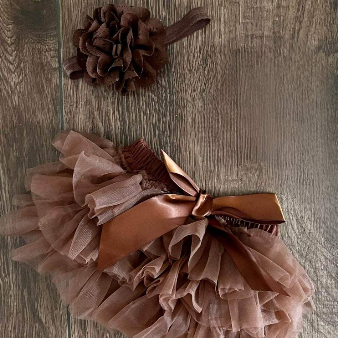 - Gonna con coulotte a balze di tulle color moka, rifinita con fiocco in raso