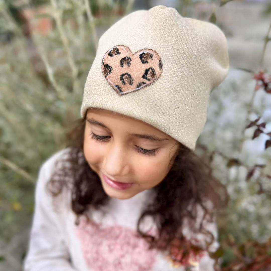 💛 Cappellino bimba in morbida maglia lurex oro, dipinto a mano con cuore o fiocco. Personalizzabile con nome o scritta.