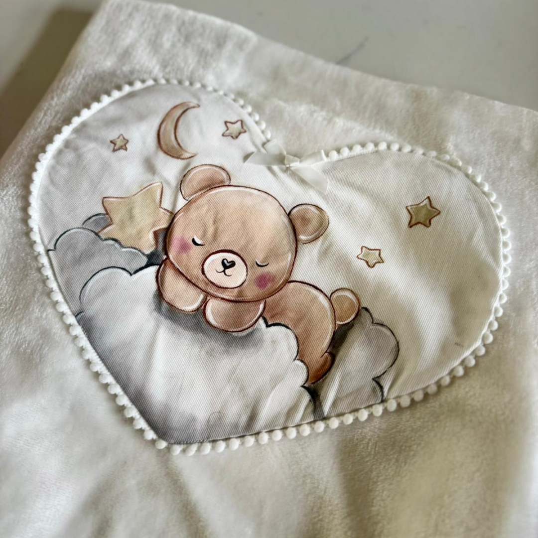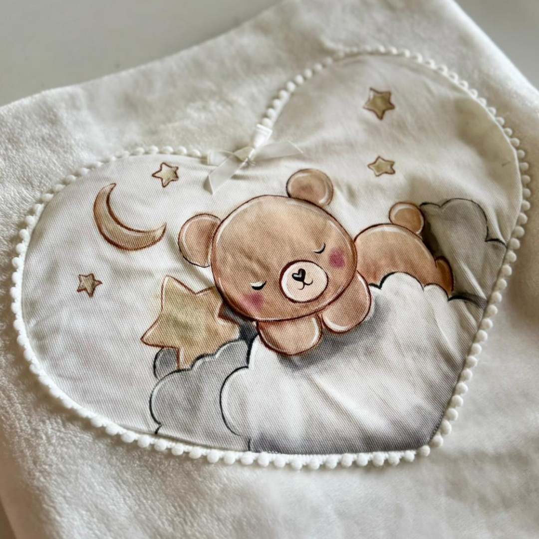 🧸 Morbidissima copertina da culla in pile pelliccia color panna. Disegno orsetto dipinto a mano. Personalizzabile con nome/scritta. Dimensioni 70x100 cm.