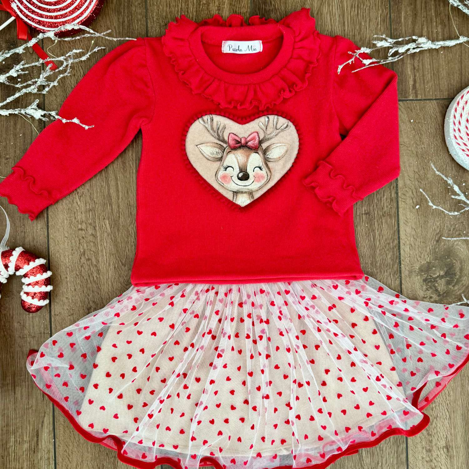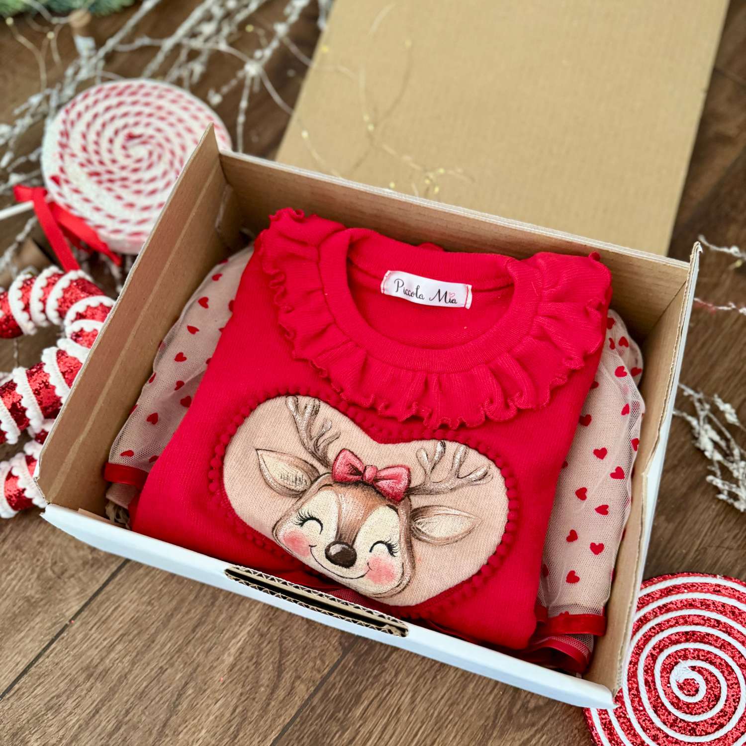 - Maglia in caldo cotone r osso con rouches al collo e maniche, renna dipinta a mano su cuore riapplicato, rifinitura con pon pon. Personalizzabile con nome!